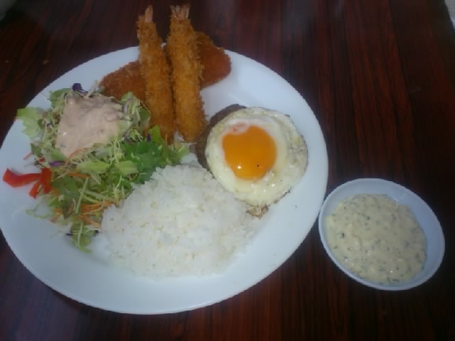ハンバーグの上には目玉焼き、海老フライにハムカツ、サラダ、、、